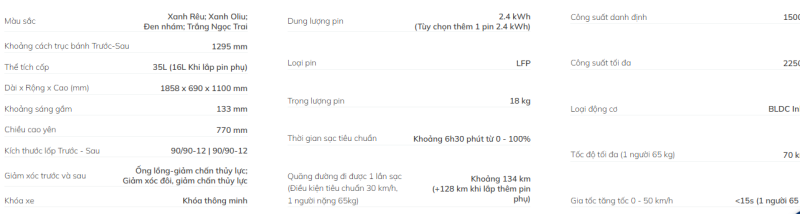 Khẳng định ưu thế với quãng đường di chuyển đạt tới 262 km/lần sạc. Tốc độ tối đa 70 km/h, vận hành mãnh mẽ và tăng tốc từ 0 – 50 km/h chỉ trong 15 giây.